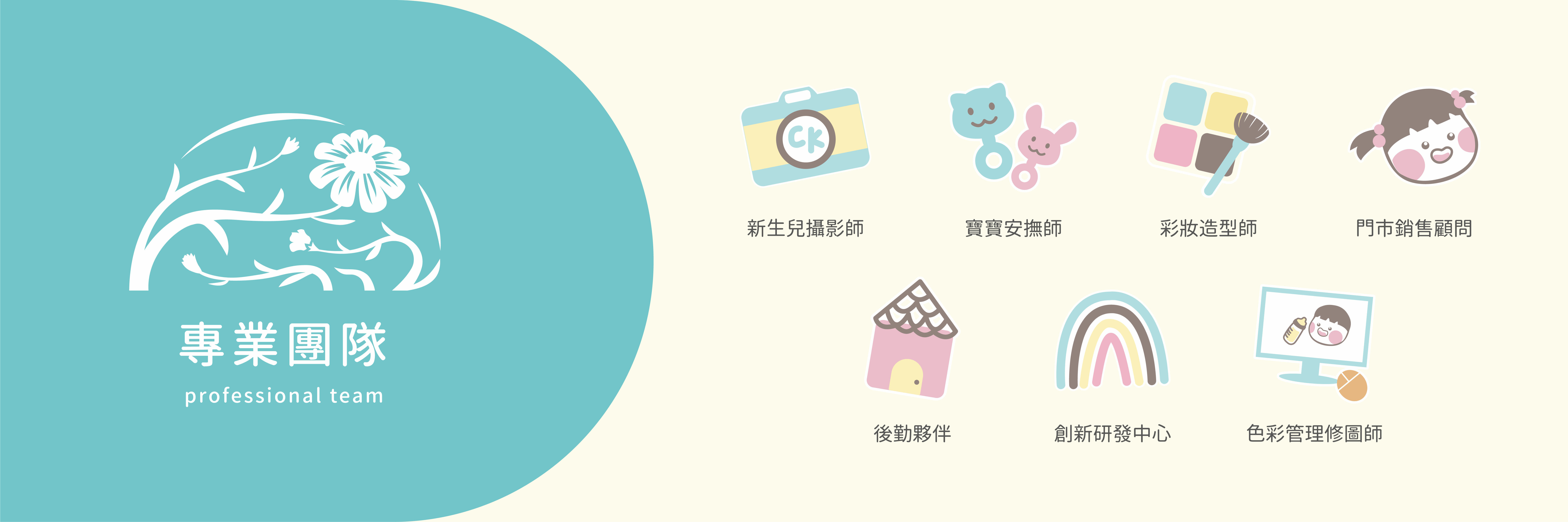 專業幼保人員,隨側在旁邊留意寶貝需求安撫寶貝,有效引導寶寶完成拍攝,是拍攝時重要的一員。